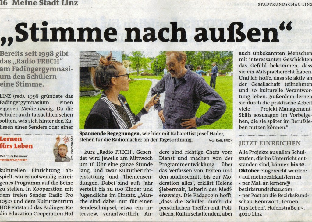 Hier gleich zu Beginn die FRECHe Radio-Sendung zum Jubiläum: https://cba.fro.at/383834 Unter dem Titel: 20 Jahre – 20 Stimmen werden 20 Jubiläumssendungen von Radio FRO ausgestrahlt – die FRECHen Fadinger haben EINE davon gestaltet …