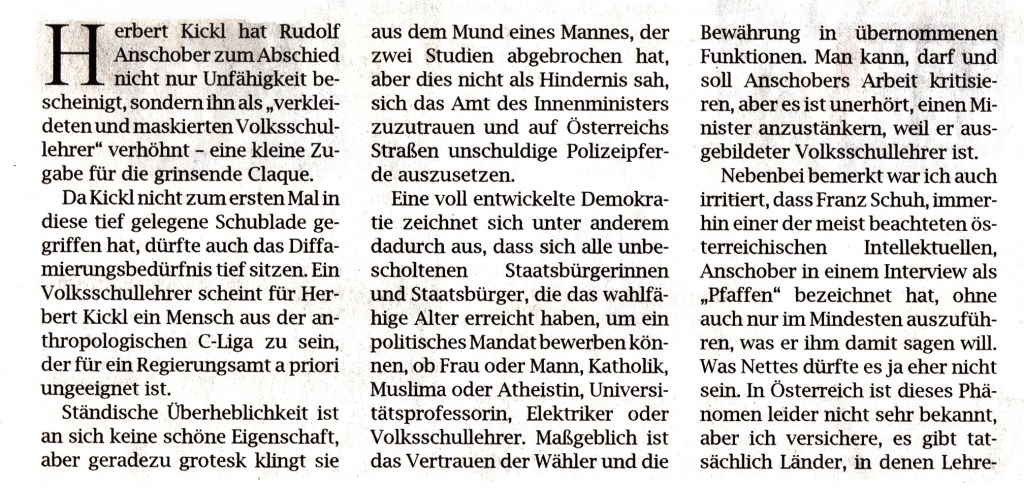 Dankenswerterweise übernahm (siehe oben) Dr. Christian Schacherreiter medial die Standesvertretung der GrundschullehrerInnen ! Es handelt sich bei dieser großen und für die Bildung der Kinder über die Maßen wesentlichsten Berufsgruppe um gar nicht so wenig WählerInnen, die die Botschaft sicher verstanden haben … Eine der vielen verzichtbaren mit plumpen, unmaskierten Inhalten überfrachteten, lauten „Büttenreden„, die als solche eigentlich im Parlament klar deplatziert sind, aber alle Bierzelte und Aschermittwochhallen sind ja derzeit noch aus pandemischen Gründen geschlossen … Für einen „Salzburger Stier“ werden solche Sager garantiert nie reichen – für einen beliebigen Hornochsen (am Spieß) aber vielleicht schon …