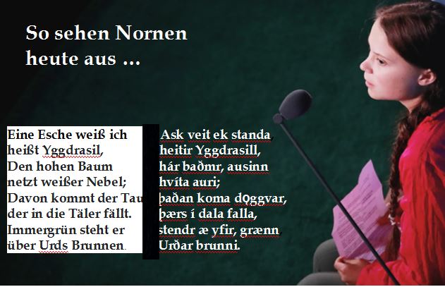 In Ragnarök findet Thor wie die meisten anderen Asen sein Ende, bezeichnenderweise durch die Midgardschlange. Die Schlange greift Thor an und verpestet durch ihre Ausdünstungen das Meer und die Luft. Thor erschlägt sie mit seinem Hammer, wankt aber neun Schritte zurück und ertrinkt dann in den Giftströmen, die das öde Untier ausspeit … Das klingt verdammt nach altgermanischen „Verschwörungsmythen“. oder handelt es sich doch um real begründbare >Klimabedingte Weltuntergangsszenarien<, die heute die Frija-day for Future-AktivistInnen auf den Plan gerufen haben !