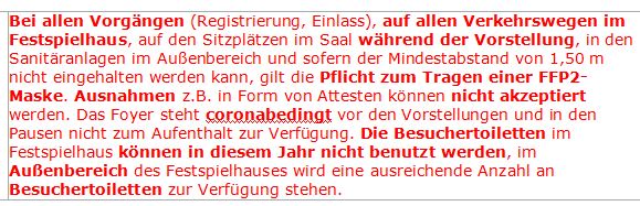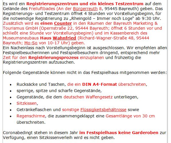 3 x während der heurigen BT-Festspielzeit wird es als Special Event ab 16.00 im Festspielhaus konzertante Walküren mit Malaktionen von Hermann Nitsch und davor als >Matinee< um 11.00 „Gerichtverhandlungen“ mit dem listigen Loge geben. Wie schwierig sich dabei wohl schon die Proben am Areal des Grünen Hügels anlassen dürften, ist den Hygiene-Regeln der Bayreuther Festspiele zu entnehmen – Ein banal Grüner Pass dürfte hier nicht reichen und den Nornen wäre beim Lesen des coronesken Regelwerks dabei wohl der Geduldsfaden gerissen ! – wie Berti Blockwardt in Graz: