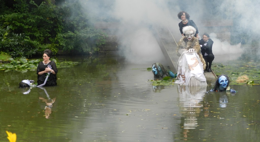 Punkt 11 Uhr begann es nicht nur kurz zu nieseln, sondern es brach auch heftig Bühnennebel herein. Auf einer Rampe vor dem Vorhang erschien Puppe Erda im Rollstuhl synchron zur einsetzenden Musik belebt durch Regisseur Nikolaus Habjan. Die tollen Gesangsstimmen erklangen perfekt abgemischt mit dem orchestralen Kammermusikensemble via Lautsprecherboxen. Versprochene Rheingoldanklänge sind in der Komposition Gordon Kampes nur sporadisch überdeutlich verpackt, unterstreichen so aber die Eigenständigkeit des kleinen. feinen Musikdramas, das gesamtkunstwerklich durch seine Bilder lebt: Wenn Rheintöchter durch den Teich pflügen, mit Fischen & Wasser spielen, Wotans Auge gefunden wird, das er hier an „Mimirs Brunnen“ dereinst für Weisheit geopfert hatte. Drei ganz hervorragende, textdeutliche Sänger leihen dabei den Puppen ihre Stimmen, um schließlich mit ihnen eins zu werden. So wurde nicht nur bei der Kinderoper mit Sängern erster Sahne besetzt, wie Tristan Stephen Gould, auch am Tümpel durfte man mit Hügel-erfahrenen Leuten plantschen & ihnen lauschen: Mit Ausnahme von „Erda“ Stephanie Houtzeel (Waltraute der 021er Walküre), mussten sie daselbst ins Wasser. So auch Rheintochter Daniela Köhler (2020 als Brünhilde geplant gewesen), sowie der österreichische Bariton Günter Haumer als Feuergott, der hierbei zu erlöschen drohte, als die Damen an einem „Freitag for Nature“ nach der Götterdämmerung unter Yggdrasil über Loge zu Gericht saßen, umwabert vom Eschensterben, sowie dem Neid & der Asche der Götter & Helden …