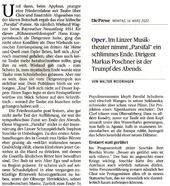 Ungesalbt in den goldenen Schuhen des Fischerkönigs Amfortas, mit goldener Asche am Haupt retourniert „Erlöser“ Parsifal die heilige Lanze (aus der Schatzkammer der Hofburg) und genießt in der Gralsburg (– im Linzer Mythen-Navi scheint diese nicht in den Pyrenäen, sondern am „Obersalzberg“ angesiedelt) den Ausblick durch das arg berühmte, dortige Fenster – eine eher unnötige Transformation in die Untiefen der jüngeren Geschichte … Schwant dem wachen Rezipienten …