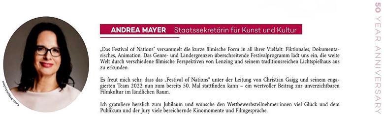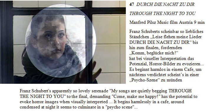 Auch nachdem Christian Gaigg vonErich Riess die Leitung übernahm und nun bereits >10< Jahre erfolgreich das Programmkino Lenzing bespielt, sind die Fadinger u. a. mit ihren Absolventen-Produktionen im Programm vertreten – so auch heuer, diesmal mit dem Musikhorrorvideo „Durch die Nacht zu dir“ (Franz Schuberts „Ständchen“) – als Linz-Repräsentanten unter 90 Filmen im gut besetzten internationalen Starterfeld der Jubiläumsausgabe (21. bis 26. Sept. 022) …