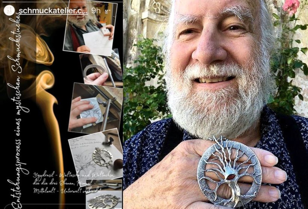 Der Jubilar „überraschte“ sich selbst mit einer Kreation, die er heuer gemeinsam mit Schmuckdesignerin Claudia Langer im Rahmen eines Workshops schuf : Das Amulett Yggdrasil – ein „schmuckes Fanal“ zur Klimaproblematik, unter deren Auswirkung speziell selbiger „Schneelöwe“ diesen Sommer 022 wieder heftig litt !!!