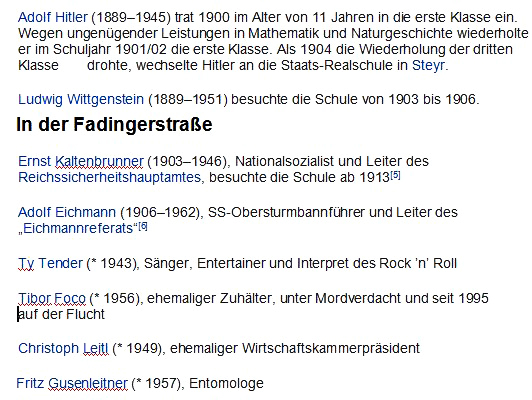 Ein Abschnitt berühmter Lehrer des Hauses (wie bei anderen Schulen üblich) kam nicht vor und bei den Schülern glänzte man nebst dem Aushängeschild Wittgenstein zu 50% mit Kriegsverbrechern & einem nicht restlos geklärten Kriminalfall: