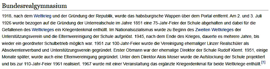 Der nun finale Wikipedia-Auftritt unseres Fadinger BRGs endet geschichtlich in der Jetztzeit, weist die richtigen Jahreszahlen auf und als Schülerneu u. a. auch den Komponisten Arnleitner, den Maler Brosch und die Unternehmer Andlinger sowie Sohmen. Lehrernamen, wie: Schaller, Strahammer, Eder de Lastra usw. tauchen mittlerweile hier auf … Statt der ursprünglich nur 4, gibt es nun ganze 27 belegte Einzelnachweise zum umfangreichen Text (- selbst das urspr. Start-Kapitel Architektur wurde ergänzt).