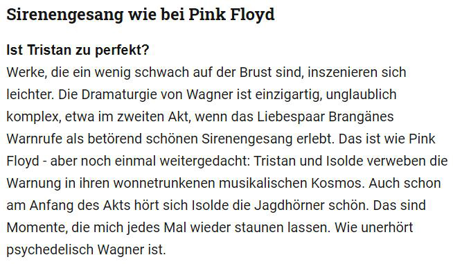 Wagner wirkte im klimatisch vergleichsweise kühlen 19. Jahrhundert. Sein damals, mit den Mitteln modernster technischer Erkenntnisse ausgestattetes Festspielhaus bräuchte heutzutage keine Klimananlage oder gar Erd(a)kühlung aus den Tiefen des grünen Hügels, denn der Meister hätte sich da wohl eher für einen Kulturherbst à la Linz, oder à la longue Wagners’sche Winterfestspiele Mitte Februar erwärmen können. Auch ein „Winterstürme wichen dem Wonnemond“-Festival rund um den 22. Mai wäre cooler als hochsommerlich tropische 35 Grad zur Premiere …