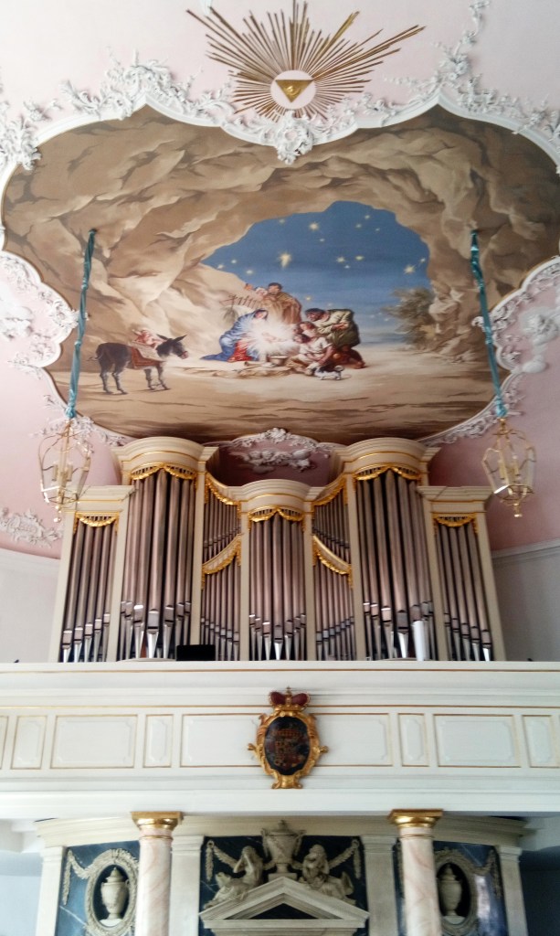 Die Bayreuther Schlosskirche samt „Bruckner-Orgel“ und weihnachtlichem Deckenfresko:
