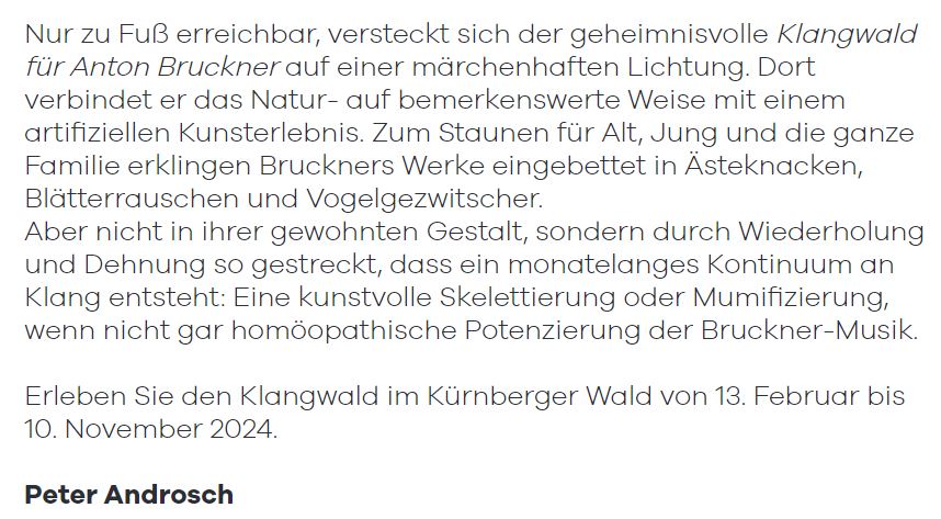 Komponist Peter Androsch (Teilzeit“Bayreuther“ aus Wels)) begeht sein Brucknerprojekt „Klangwald„ im Kürnbergerwald: