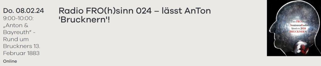 Das Projekt im Jubiläumsjahr: > Radio FRO(h)sinn 024 lässt AnTon „Brucknern“! < –FROsinnig, weil das SeniorenRadio froh und in alter Frische auf 105,0 sendet, Anton Bruckners Linzer Liedertafel den Namen „Frohsinn“ führte und er mit ihr große Erfolge feiern durfte. So wird dem Genius Loci A. Bruckner von uns auf FRO in jedem Monat des Jubiläumsjahres mindestens eine 60 Min-Sendung am jeweils zweiten Donnerstag des Monats um 9 Uhr gewidmet sein – spontan auch an diversen anderen Donners- & Dienstagen … Jederzeit abrufbar auf CBA im Netz <<<