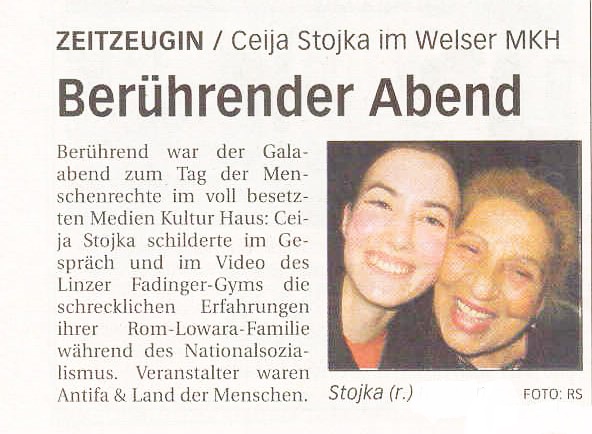 Und wieder nach Ebensee: Ab 5. Juli Ceija Stojka – Ausstellung im Museum Ebensee. – Zeitzeugin und Künstlerin. Schon 2004 entstand im Rahmen des Linzer Mediengyms eine Video-DOKU mit Ceija Stoika -inkl. einer Radioaufzeichnung der Präsentation – in der nunmehrigen Juli-Sendung ist ein kurzer Ausschnitt mit der Zeitzeugin im Originalton zu hören <<<