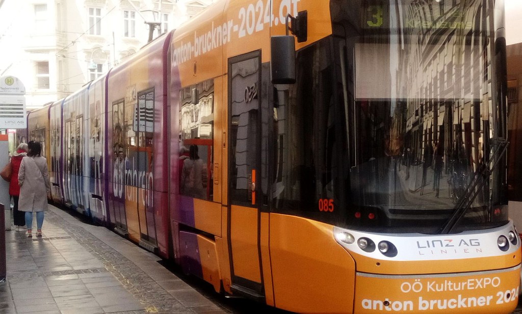 Seit Jänner024 ist nun die EXPO am Zug – auch bei der Linz-AG (- siehe Bild oben) … zu Bruckners Zeiten fuhr die Straßenbahn 1880 noch mit echten, Hafer fressenden Pferdestärken. Ein Jahr zu spät: 1897 stieg man auf elektrischen Strom um – auch die Pöstlingbergbahn hat der Jubilar so knapp verfehlt. Für einen Besuch in der Grottenbahn (* 6. August 1906) hätte er gar 10 Jahre älter werden müssen …