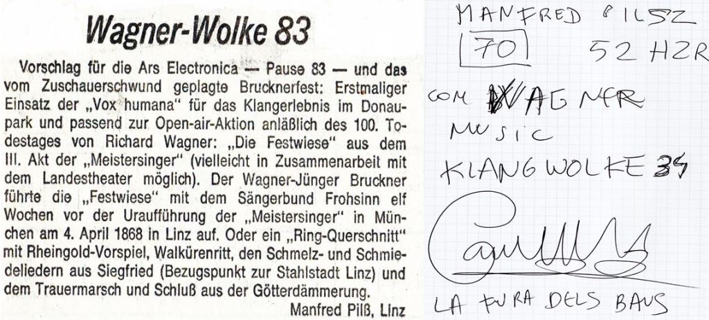 Jenseits der 52-Hz-Walgesänge fand ein spontanes Interview mit Carlus Padrissa (Chef von „La Fura dels Baus„) statt, das dieser unkonventionell (wie immer) mit dem Blogautor führte – ausgehend von seinen Linzer Arbeiten (KW & „Parzival“ zur Eröffnung des Neuen Musiktheaters) … dem wackeren Katalanen wurde dabei das Versprechen einer Wagner-Wolke für Linz im Jahr 2034 entlockt: