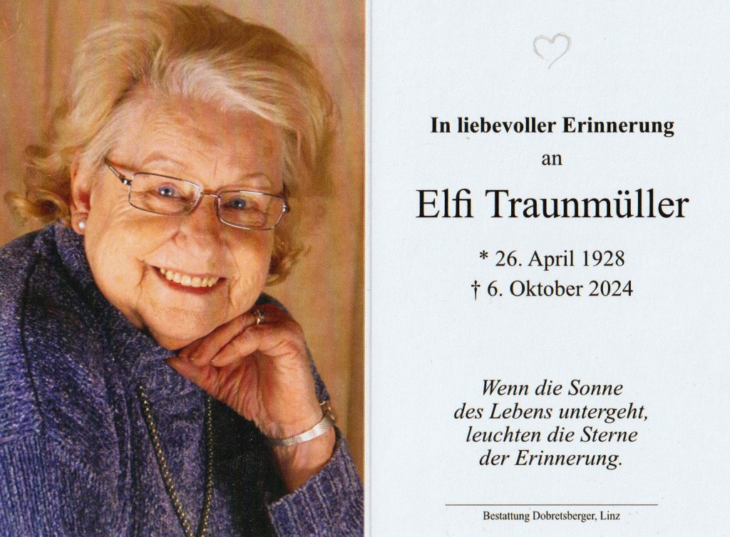 Die Tochter eines Polizisten wuchs im Linzer Franckviertel und eingebettet in die umfangreiche Mühlviertler Verwandtschaft in Pregarten auf. Volks-, Haupt-und Handelsschule absolvierte sie in der damaligen Gauhauptstadt von Oberdonau. Der BDM blieb ihr nicht erspart, auch nicht das Kriegsende und die Besatzungszeit, welche sie zum großen Teil in Pregarten mit ihrer Jungtante Elli erlebte, wo sie sich im Umfeld des Haslinger Wirtshauses aufgehoben und umsorgt fühlen durfte. Die sogenannte „Russenzeit“ war nicht leicht für das Viertel nördlich der Donau. Ihr Leben veränderte sich grundlegend, als sie den Russland-Heimkehrer Karl Traunmüller kennen- und lieben lernte. Student Karl ließ ihr vom Studienort Graz viele Zeilen Post zukommen – Liebesbriefe, die sie noch solange sie in ihrer Weingarten-Wohnung lebte immer wieder las, ja selbst noch im Seniorenheim zitierte. Kaum, dass ihr Student fertiger Lehrer und „Österreich frei“ war, bezog man eine Wohnung in ihrem Franckviertel, heiratete und brachte als krönenden Abschluss der Familienplanung Tochter Eva zur Welt. Wie „Familie geht“ wusste die Elfie-Tant‘ schon Jahre davor, da sie ein enges Verhältnis nicht nur mit Elli, sondern auch mit Schwester Maria und deren kleinen Sohn Fritz hatte – ein Bindung, die noch enger wurde, als in Marias Familie Weiß die mit Eva etwa gleichalten Kinder Gerlinde und Lothar geboren wurden. Oft war Eva im Weiß’schen Wels zugegen, es wurde gemeinsam geurlaubt und gelebt. Auch die Achse Elli hielt: Nach der gemeinsamen Hochzeitsreise in Venedig besuchten die Neo-Linzer Traunmüller immer wieder Elli & Florian Voigt, samt den Söhnen Florian & Andreas in ihrem Familiendomizil in Hagenberg, speziell in den großen Ferien, die Karl im Haus der Mutter mit Elfie und Eva in Wartberg zubrachte. Da wurden dann auch die Zetis (Florian & Poldi Zehethofer, samt Töchtern Gerda & Helga) in Pregarten beglückt, meist traf man sich im Aisttal.