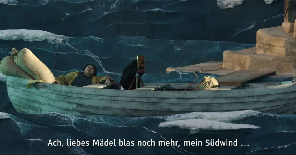Die Ouvertüre beginnt fast unbemerkt bei Taghelle – weit und breit keine stürmische See, sondern ein schroffer Steinbruch, der „Bühnen-seitig“ von mit Abstand mikrobisch klein wirkenden DarstellerInnen geflutet wird. Ihr Herumirren erfolgt dabei völlig losgelöst von den musikalischen Motiven. Senta (Tochter von Kapitän Daland) macht da keine Ausnahme, sucht scheinbar nach später günstigen Absprungpositionen, verfolgt von Jäger Erik – bewaffnet mit einem Blumenstrauß (- nun ja, ist ja auch Strauss-Jahr heuer) – sprich: Weiterhin kaum Sichtbares und ohne Konnex zur Musik … Überdimensionale starre Wellenberge (- gefroren bei 30 Grad plus) werden mit Beginn der Handlung von kleinen Booten durchpflügt – ein Bild, welches fatal an ein Urfahranermarkt-Fahrgeschäft mit kleinen Segelschiffen aus Kindertagen erinnerte. Der Holländer fliegt nicht herein, sondern nimmt erst Fahrt in die Burgenländischen Karibik mit leichter Verzögerung auf, nachdem in der Musik bereits der Anker fiel, auf dem er dann später an Land reiten wird. Der Monolog, des sich aus einem verkehrt aufgehängten Polypen schälenden Gespensts, ist durchgehend garniert mit jeder Menge sinnlos ablenkender Pseudo-Action, die jede ohnehin kaum aufkeimende „Stimmung“ zerstört. Der nächste Regie-R“einfall“ man(n)ifestiert sich in einem billigen Kantinen-„Witz“ (?) unterster Schublade, den ein renommierter Inszenator wie Philipp M. Krenn nicht notwendig hätte: Kapitän Daland weckt den Steuermann und siehe da: