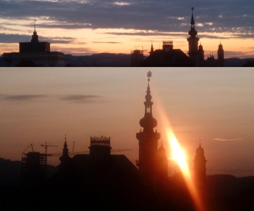 Hoch über (& ebenso in) Linz gab’s eine innerfamiliäre >Dachgleiche< zu feiern – ein perfekt geplantes, sowie umgesetztes Wohntürmchen hatte das dort hohe Straßenniveau erreicht: Die Festgemeinde konnte somit die Besichtigungstour einzelner Stockwerke bereits per Feststiege absolvieren und den Tag dann mit Blick auf dem künftigen Garten bei Speis und Trank im schattigen Erdgeschoß ausklingen lassen …
