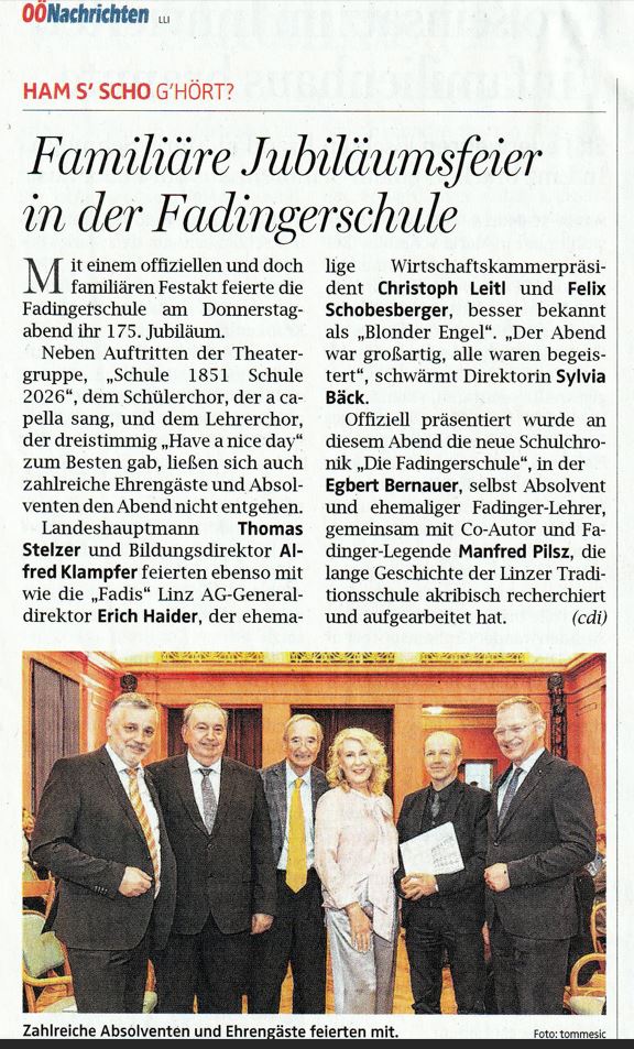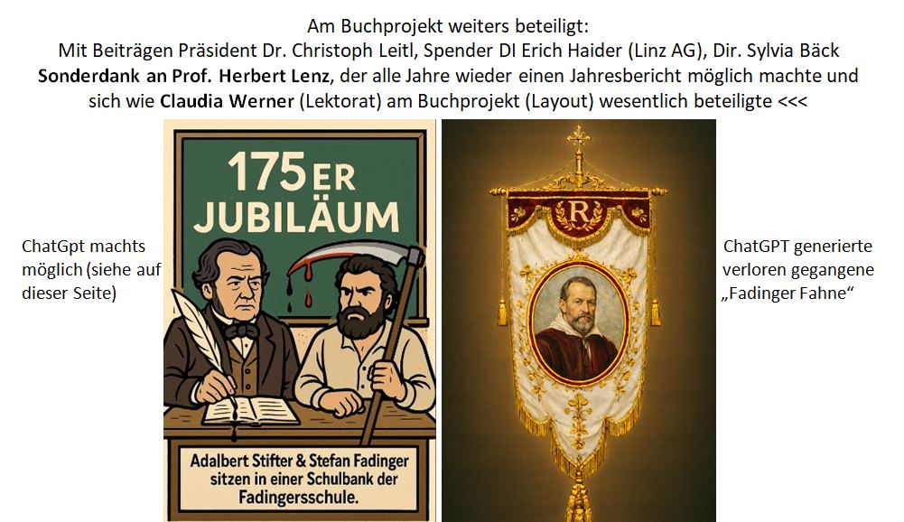 Ein Luxus, den sich andere Linzer Bildungstempel längst geleistet haben – und das ist gut so. Als Dr. Bernauer im Kepler Salon sein Buch über Ernst Kaltenbrunner vorgestellt hatte und daraufhin ein Fadinger Absolvent noch nächtens den Kriegsverbrecher aus der Fadingerschule in das tatsächlich zuständige Linzer Gymnasium auf Wikipedia umgemeldet hatte, begann bei Bernauer und mir ein Projekt zu reifen. Der Entschluss „Nägel mit Köpfen“ zu machen erfuhr dann seinen Durchbruch, als der Name Kaltenbrunner nach wenigen Wochen per Wikipedia wieder in der Fadingerstraße aufschlug. Als auch nach einer Um- und Fortschreibung der Schulgeschichte auf Wikipedia sowie dem Austria Forum der Bumerang Kaltenbrunner abermals bei uns landete, war klar, dass man dies nachhaltig nur erreichen könnte, wenn die Schulgeschichte durch einen Historiker in Buchform erledigt würde. Sprich: Bernauer schreibt das Buch und ich bring mich mit Recherche, Archiv und eigenen Zeilen ein. Fehlte nur noch ein entsprechender Anlass das Ding loszutreten. Dies ergab sich, als ich eingeladen wurde mich beim Festkomitee zum 175er unserer Institution einzubringen. Da ich bereits beim 140er geübt hatte und das 150er Jubiläum stemmen durfte, sagte ich mit der Buch-Idee im Hinterkopf zu. Da ich damals gerade an Vorbereitungen zu einem Kepler Salon laborierte, schlug ich der dortigen Leitung vor einen weiteren Abend exklusiv für den 175er der Fadinger einzuplanen, denn mir war schon in meiner Aktivzeit als Lehrer wichtig unser aller Haus mit der Öffentlichkeit jenseits des Schultors in Kontakt zu bringen. Dies wurde dann in der am 19. Jänner 026 in Form eines Wittgenstein, Sprache, Schule, KI-Abends erfolgreich umgesetzt. Unser Hauptprojekt aber sollte im Sinne der heute bei Stadt- und Landesförderungen obligat erwünschten Nachhaltigkeit das Fadinger „Geschichtsbuch“ werden. Es gelang mir die Skepsis im Rahmen der Komitee-Sitzungen betreffend des mangelnden Interesses einer möglichen Leserschaft zu zerstreuen und die Vorbereitungen einzuleiten. Zu diesem Zweck kontaktierte ich die Kulturabteilung des Landes OÖ., die ich während meines Radioprojekts zum Bruckner-Jubiläum 2024 intensiver kennenlernen durfte. Herzlichen Dank speziell an Kulturdirektorin M. Nazzal für die Herstellung hilfreicher Kontakte, die nun eine solide finanzielle Basis garantieren. Dass sich die heurige Communale mit den Bauernkriegen beschäftigt war für uns „Fadinger“ auch kein Fehler. Darüber hinaus durfte ich erfreut bei Gesprächen mit Communale-Chef Honzig erfahren, dass Radio FRECH heuer ohnehin fixer Bestandteil dieser neuen Form der Landesausstellung sei. Dank & Anerkennung an das MRG-Leadingteam. – Die Fadinger sind immer & überall <<<